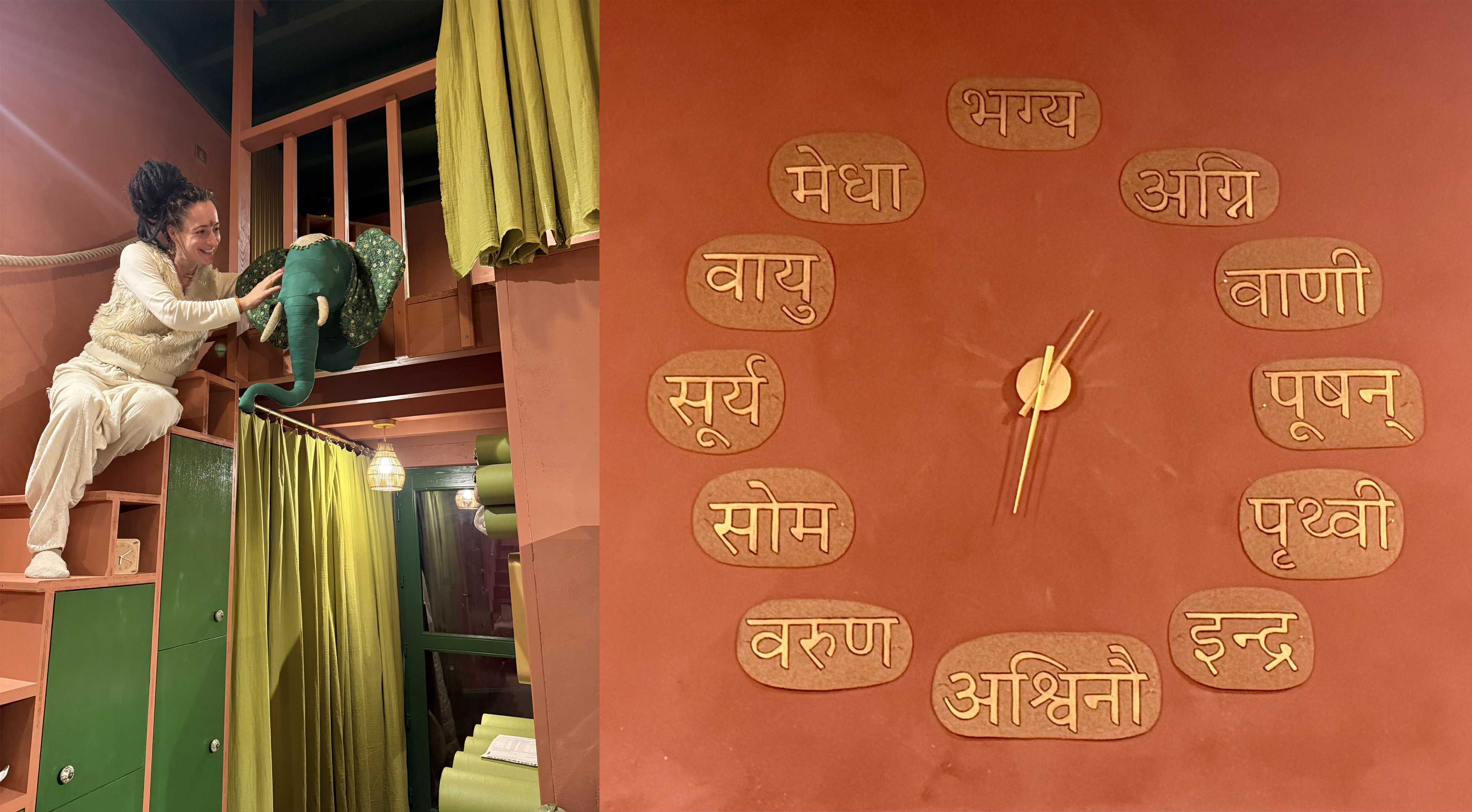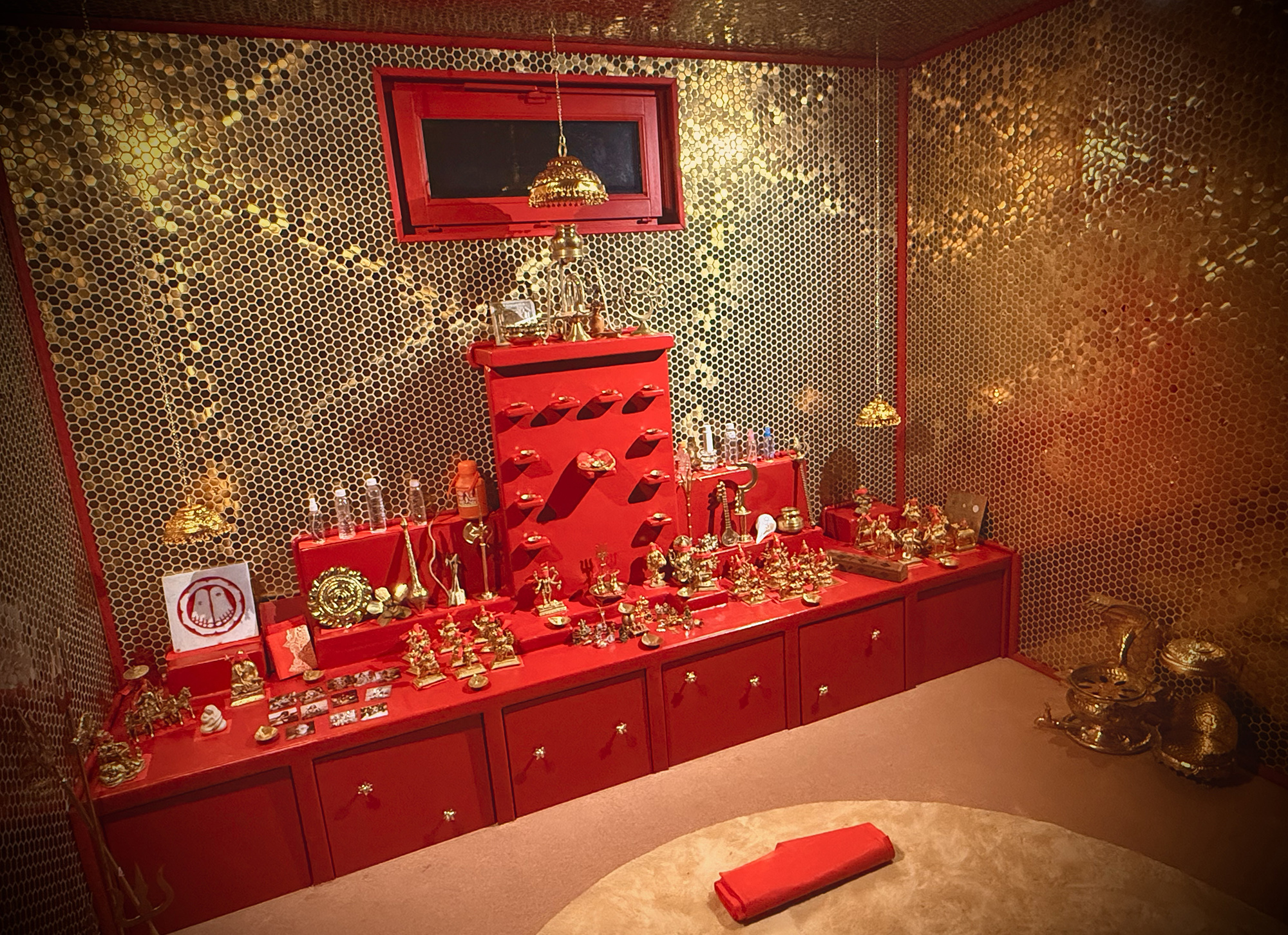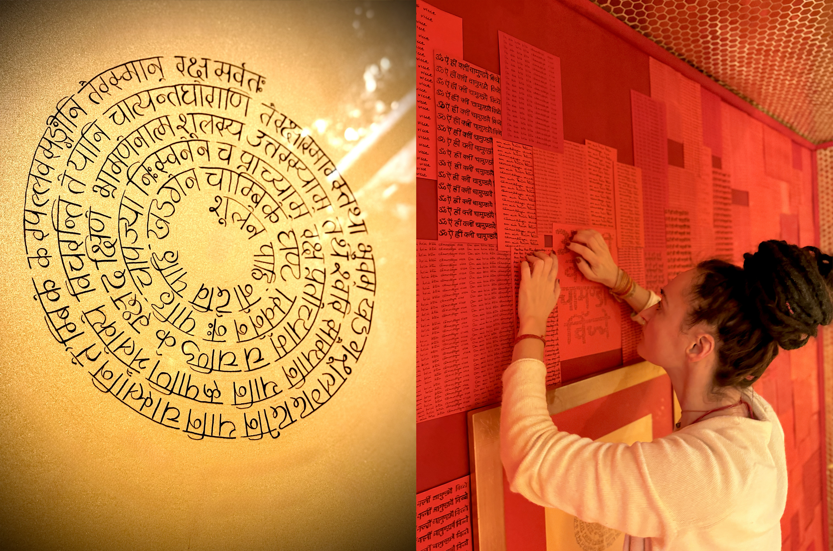 Le mur ouest de cet espace sacré est recouvert de likhita japa de Śrī Caṇḍī Navākṣarī mantra "oṁ aiṁ hrīṁ klīṁ cāmuṇḍāyai vicce" écrit par multiples personnes de la saṅga yogique en devanagari et en transliteration.